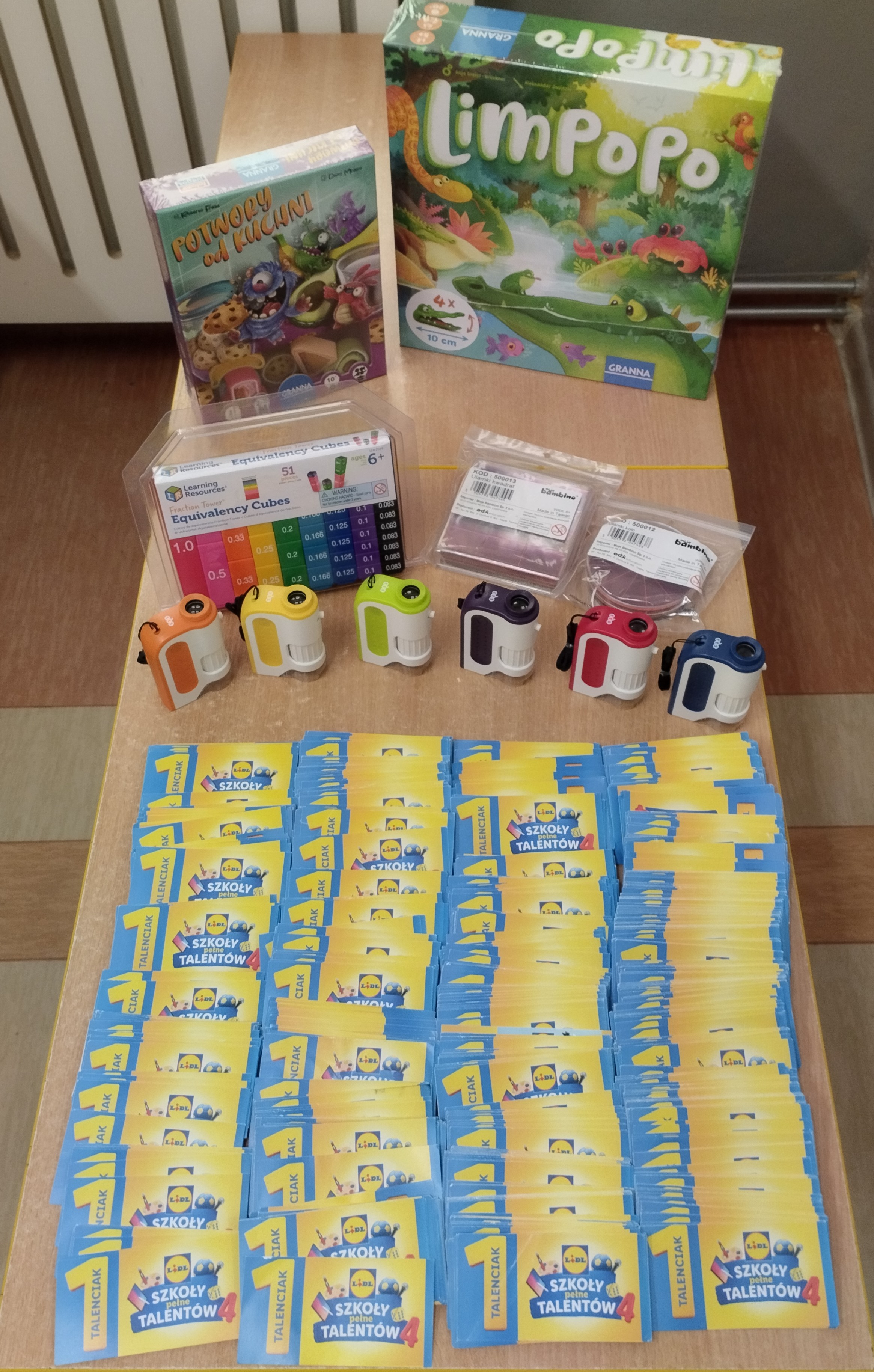 TALENCIAKI-PODSUMOWANIE Dziękujemy wszystkim osobom, które zaangażowały się w zbiórkę talenciaków. Za zebrane punkty, a było ich 1678 zdobyliśmy następujące nagrody: – 6 małych mikroskopów, – zestaw układ dziesiętny, – zestaw ułamki kwadrat, – zestaw ułamki koło, – 2 gry: Limpopo oraz Potwory od kuchni. Wszystkie nagrody uatrakcyjnią dzieciom zajęcia. DZIĘKUJEMY WSZYSTKIM ZA UDZIAŁ W